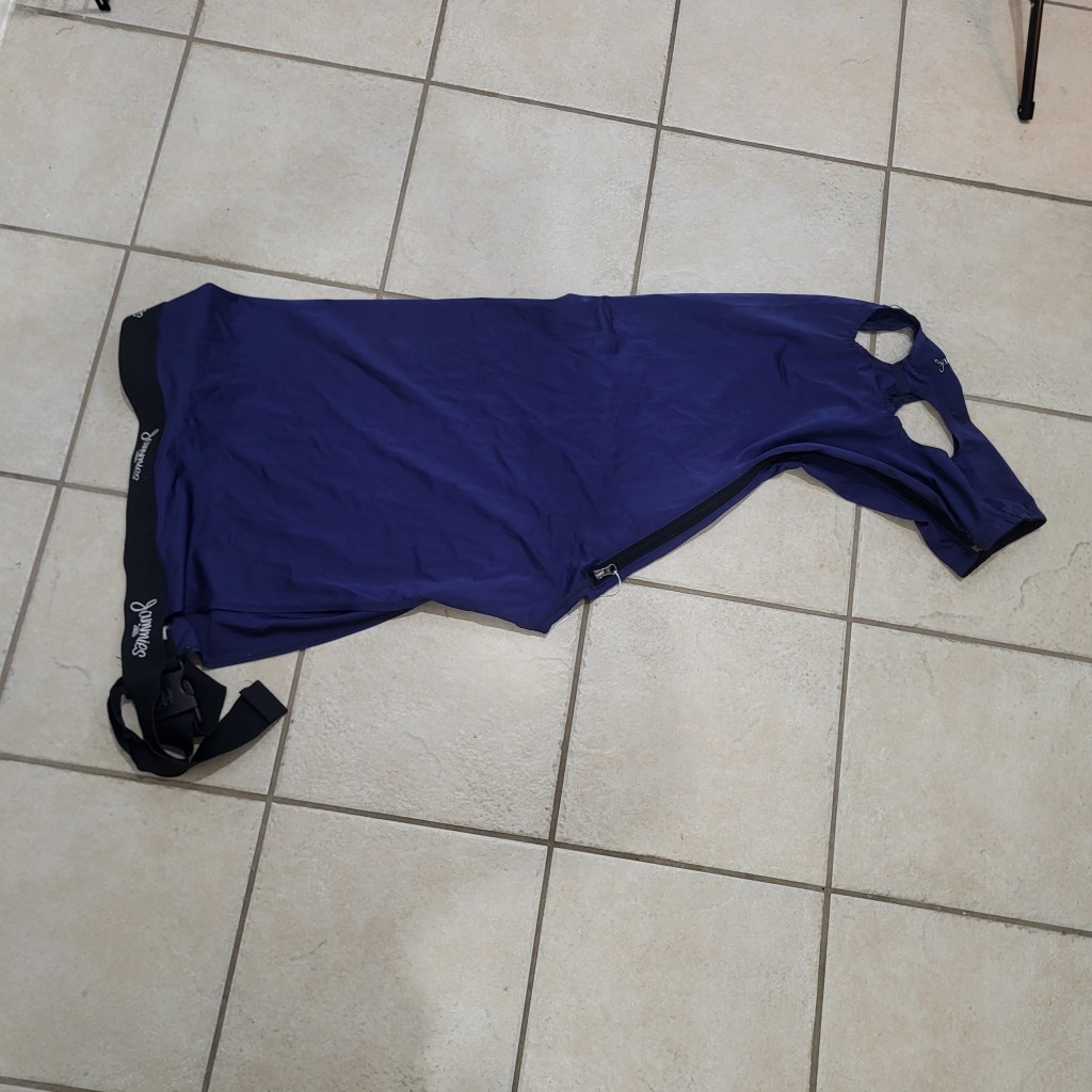 all buckles and straps are new condition, some light sun fading and a small snag on back by tail. missing the back leg straps.
